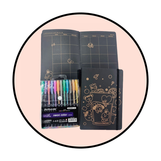 Set BTS BT21 agenda Planner hoja negra dorado+ lápices neon