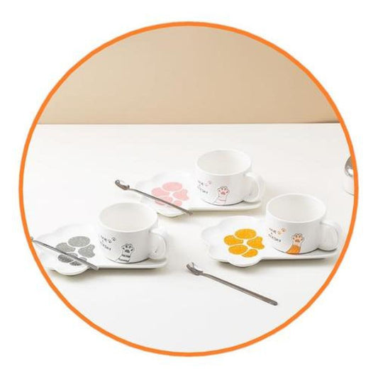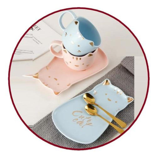 Set Cerámica tazón plato y cuchara cute cat dorado =^.^=